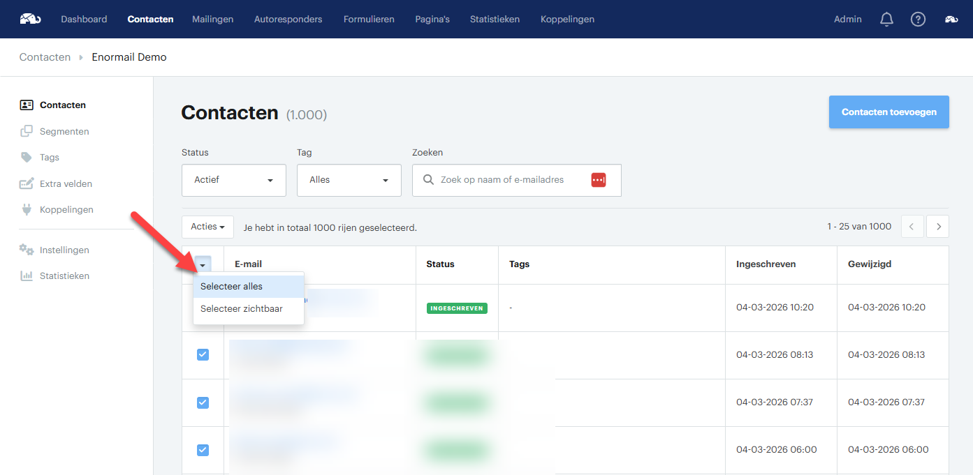 1) Klik op Contacten in het hoofdmenu en kies je lijst.