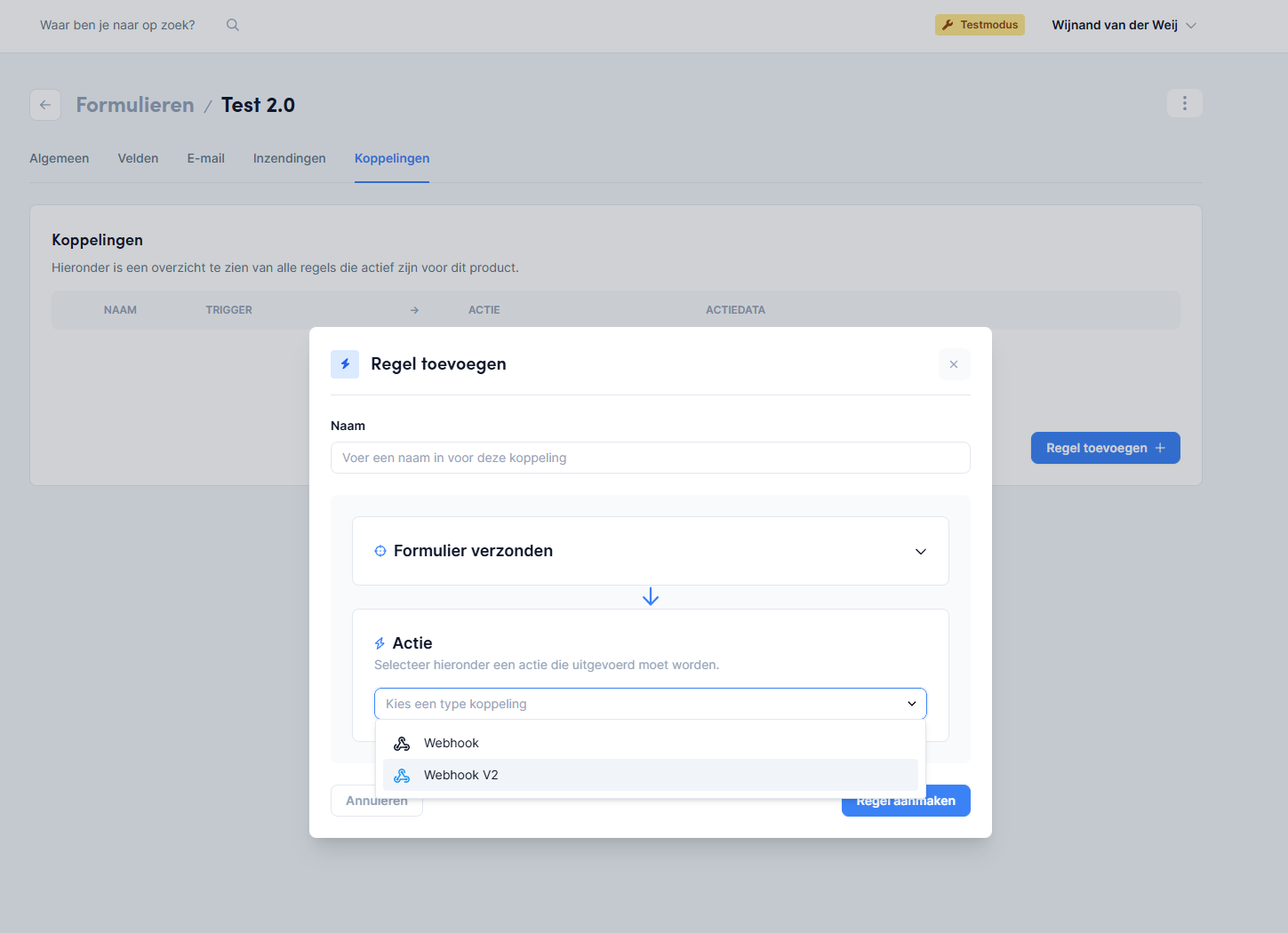 Klik vervolgens in de formulier instellingen op Koppelingen en daarna op Regel toevoegen