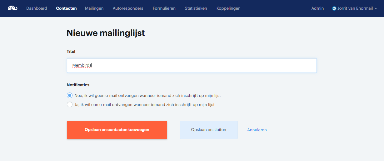 Stap 1) Maak in Enormail een nieuwe mailinglijst of kies een bestaande mailinglijst