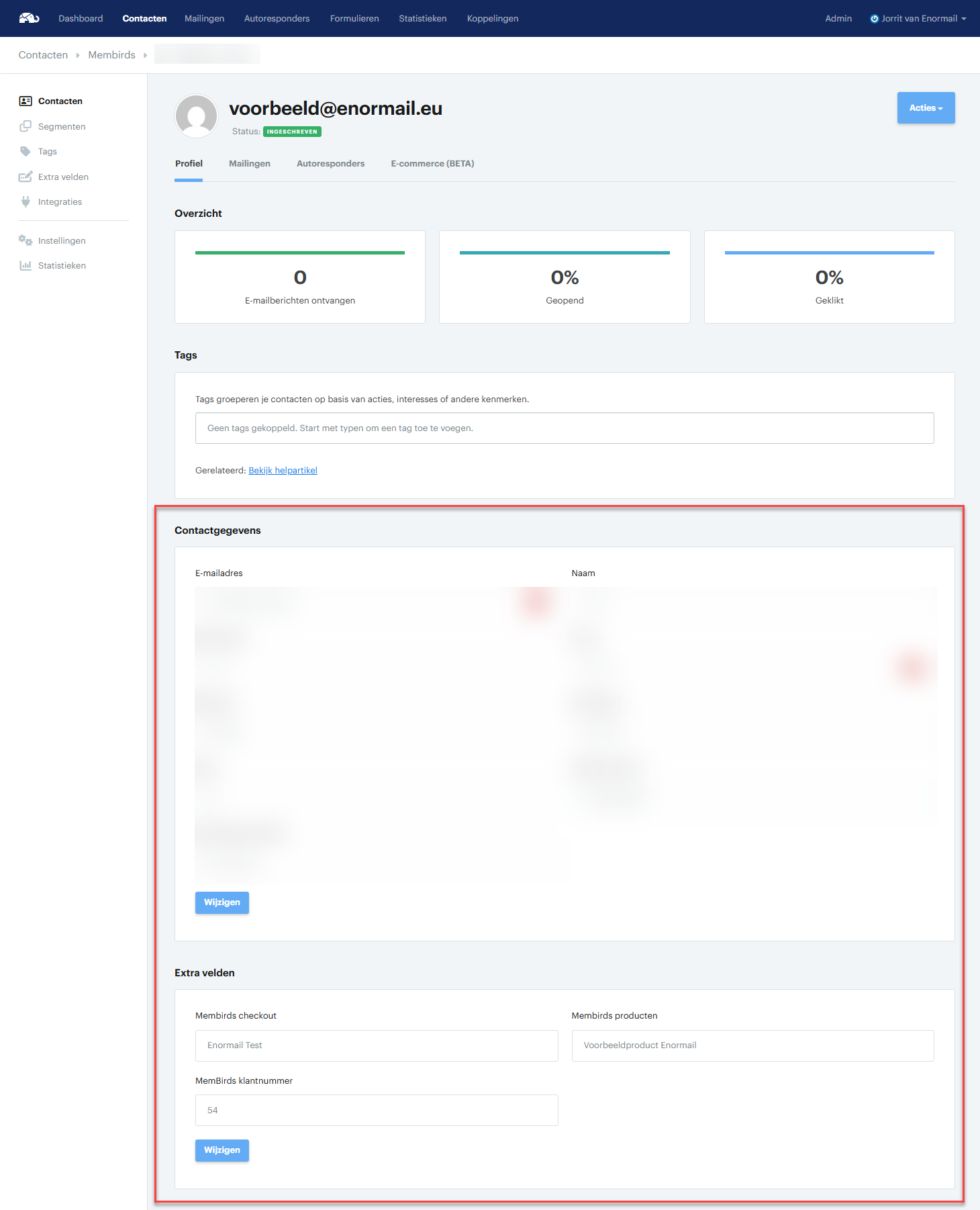 Als je het contact aanklikt in Enormail kan je zien welke velden in Enormail beschikbaar zijn. Deze gegevens kan je gebruiken in je Autoresponders of Mailingen. Ook kan je hierop Segmenteren.