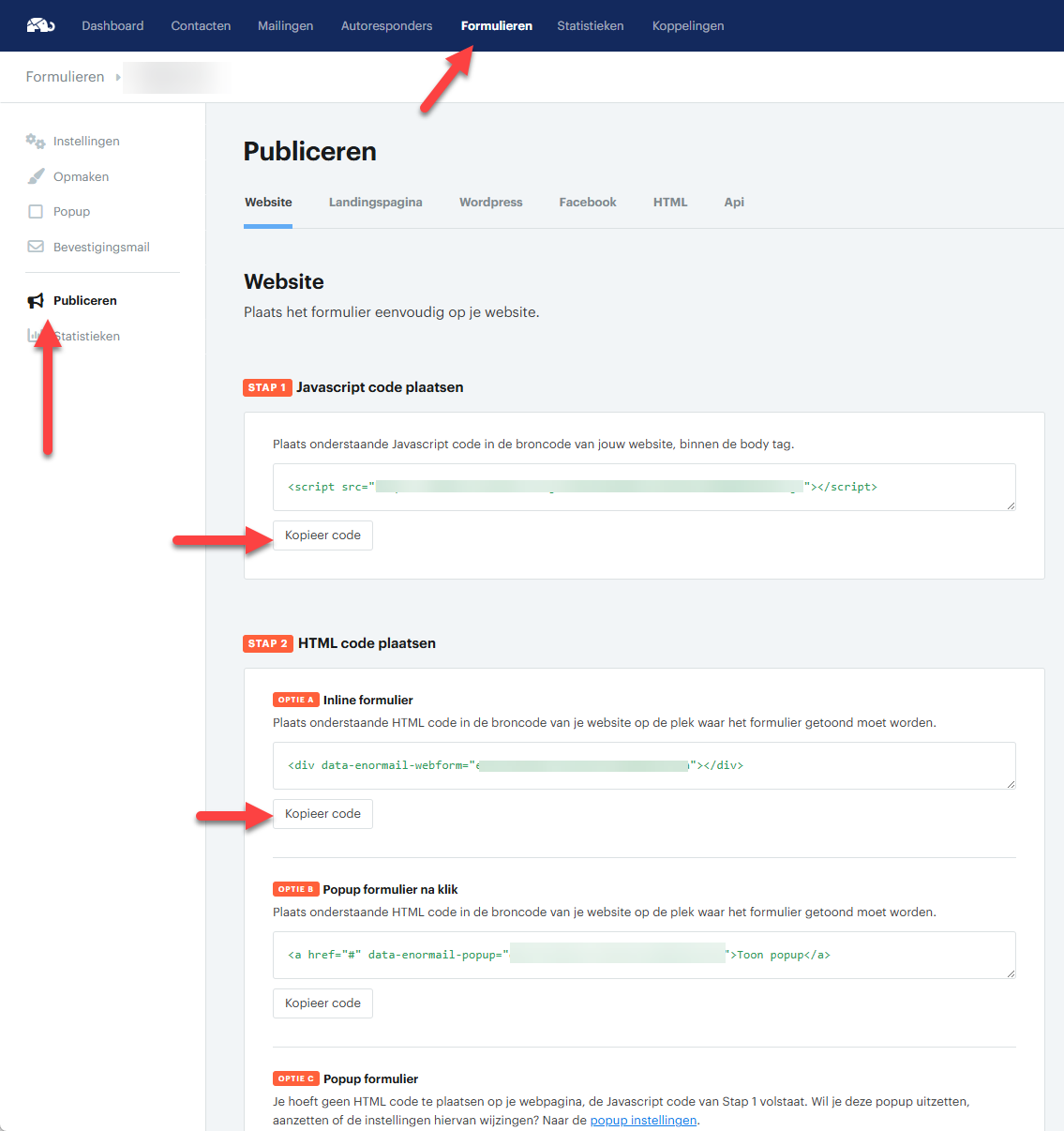 1) Ga naar Formulieren, kies je formulier, klik inde linker kolom op Publiceren. Klik nu bij op de knop Kopieer code om deJavascript coderegel te kopiëren.
