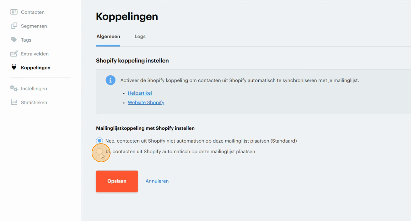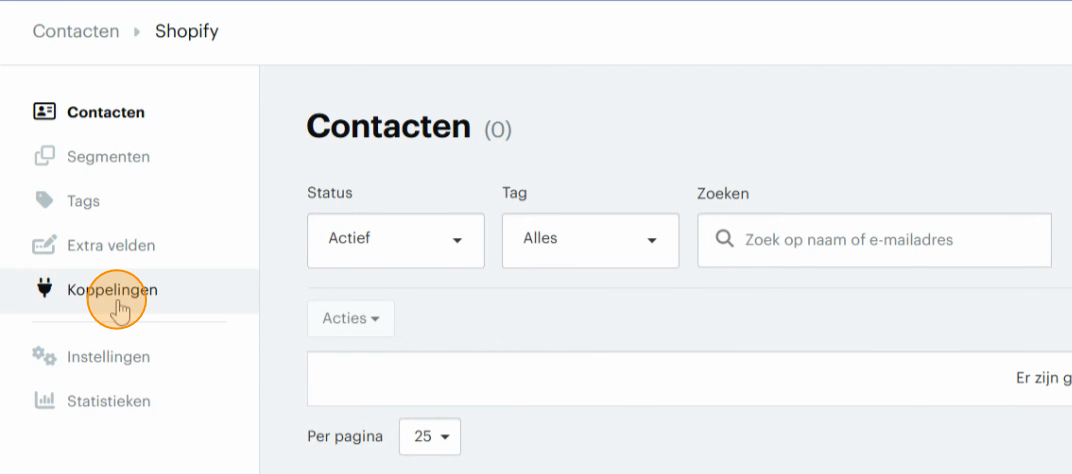 Stap 8: In het mailinglijst scherm klik je links op Koppelingen en vervolgens op het Shopify logo.