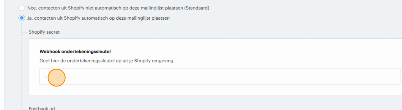 Stap 10: Plak de zojuist gekopieerde beveiligingssleutel uit Shopify in het veld Webhook ondertekeningssleutel.
