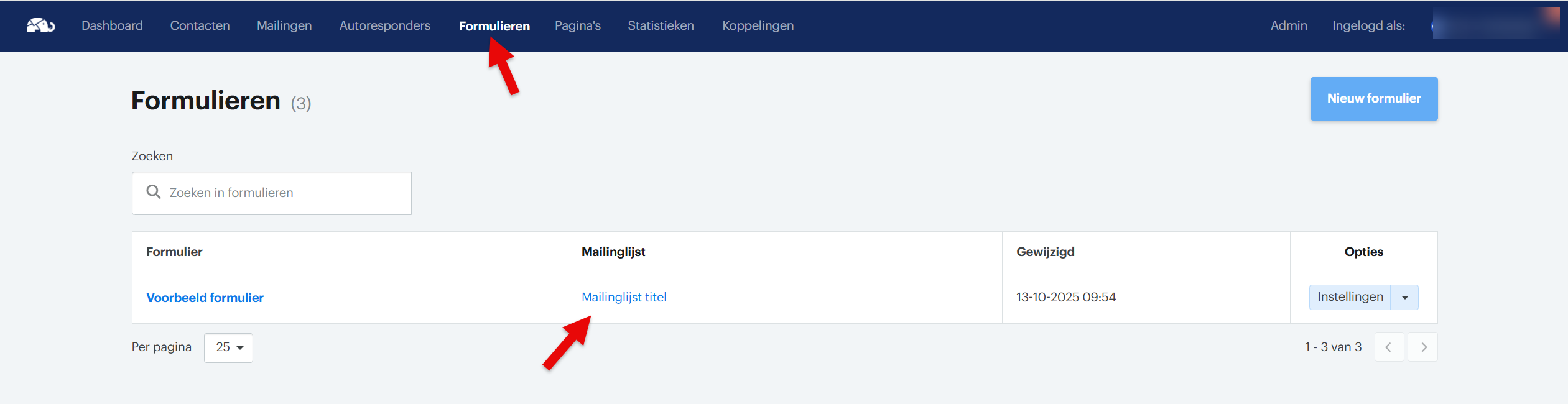 - Ga in het hoofdmenu naar Formulieren, of optioneel, klik in het hoofdmenu op Contacten, dan kom je er ook.
