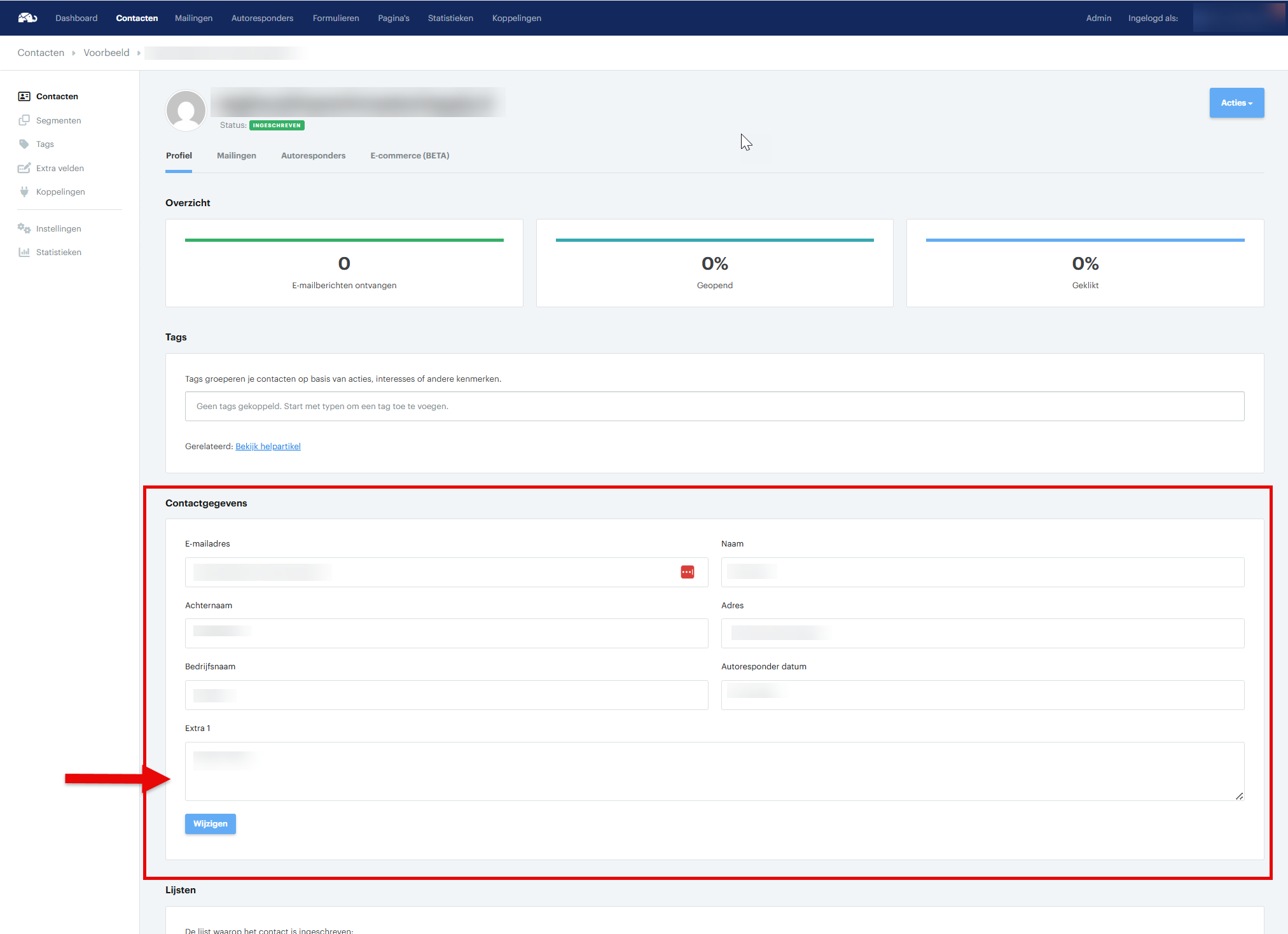 - Klik in het overzicht van alle contacten op de mailinglijst op het e-mailadres van het contact dat het formulier heeft ingevuld.