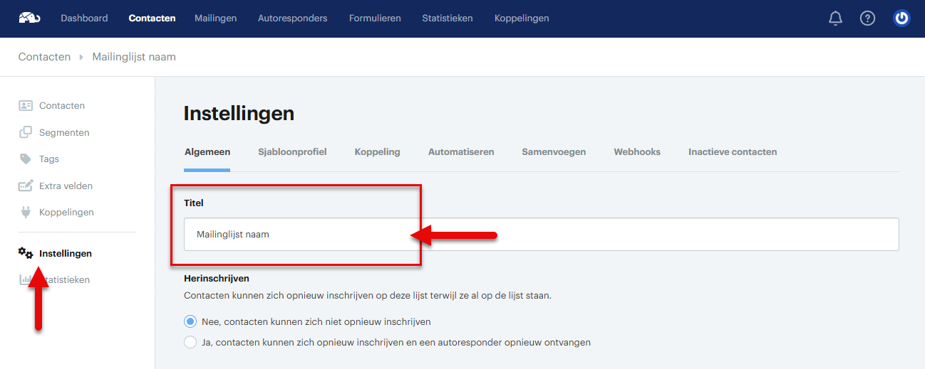 Je kunt de naam van een lijst wijzigen door naar Contacten te gaan in het hoofdmenu. Vervolgens klik je op de mailinglijst waarvan je naam wil wijzigen. Dan klik je in de linker kolom op Instellingen.