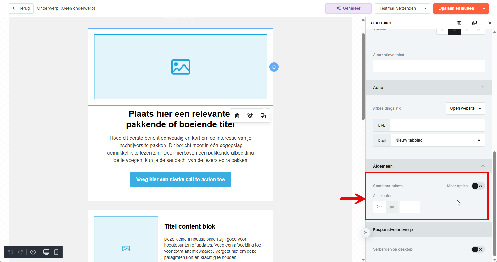 Wil je wel afbeeldingen gebruiken maar zien ze er wazig of onscherp uit? Controleer dan de breedte van je afbeelding. Een afbeelding ziet er het scherpst uit wanneer de pixelbreedte exact overeenkomt met de breedte van je mailing-template of het blok waarin de afbeelding is geplaatst. Gebruik je een template van 600 pixels breed? Sla je afbeelding dan ook op als 600 pixels breed (of een veelvoud daarvan voor retina-schermen, zoals 1200px). Hou ook rekening met de omliggende marges van het containerblok waarin de afbeelding zich bevindt.