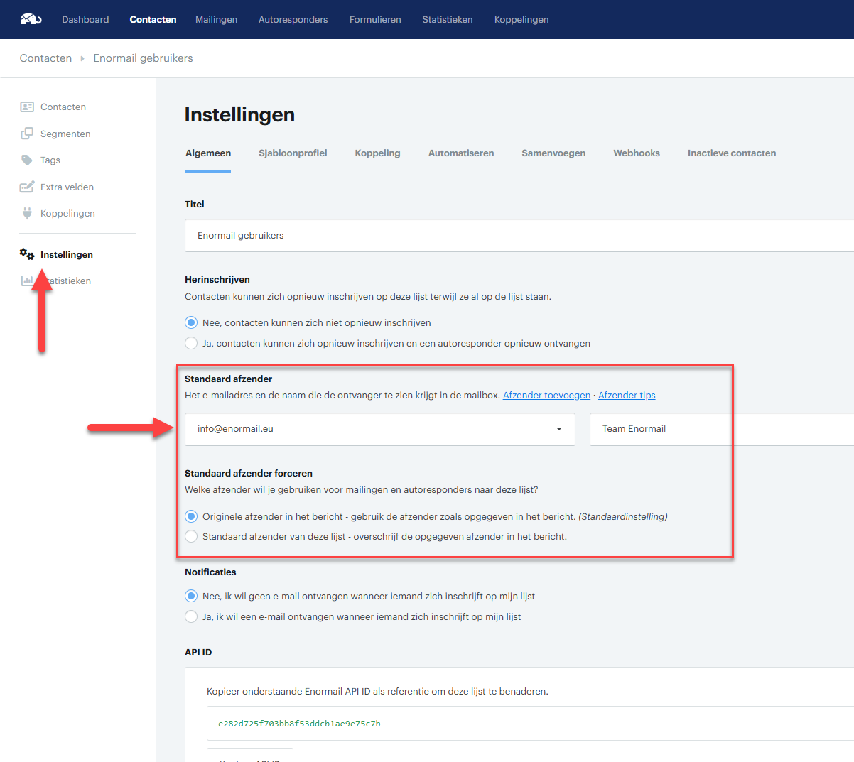 Je kan per mailinglijst ook een standaard afzender invullen. Dit doe je bij de instellingen van je mailinglijst: